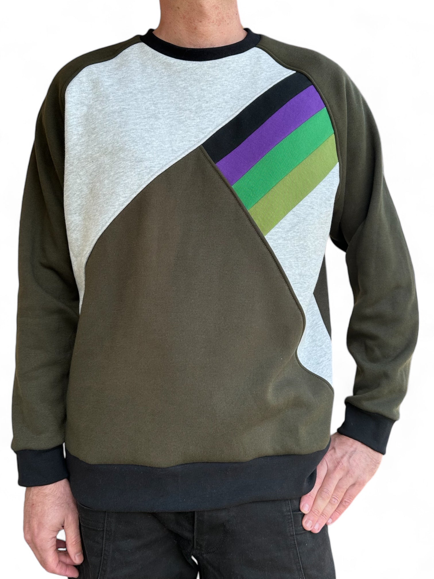 These hand-made sweaters are made from dead-stock cotton fleece. If you don’t see your size it’s possible to request a custom order with a colour combination of your choice (subject to availability).