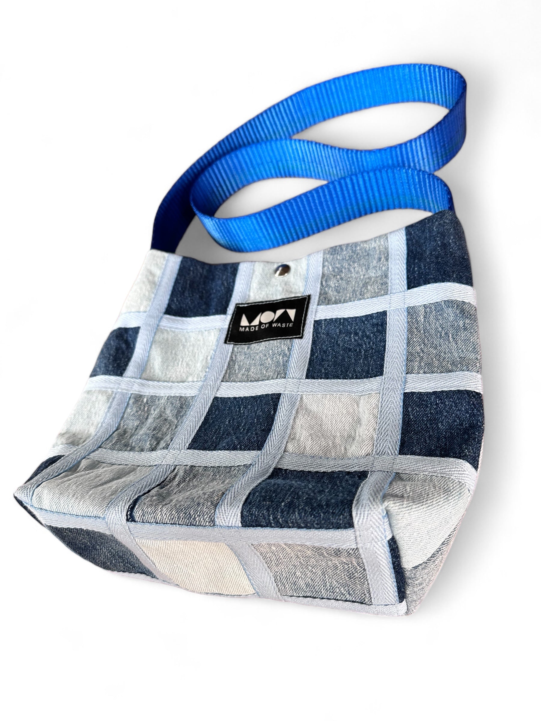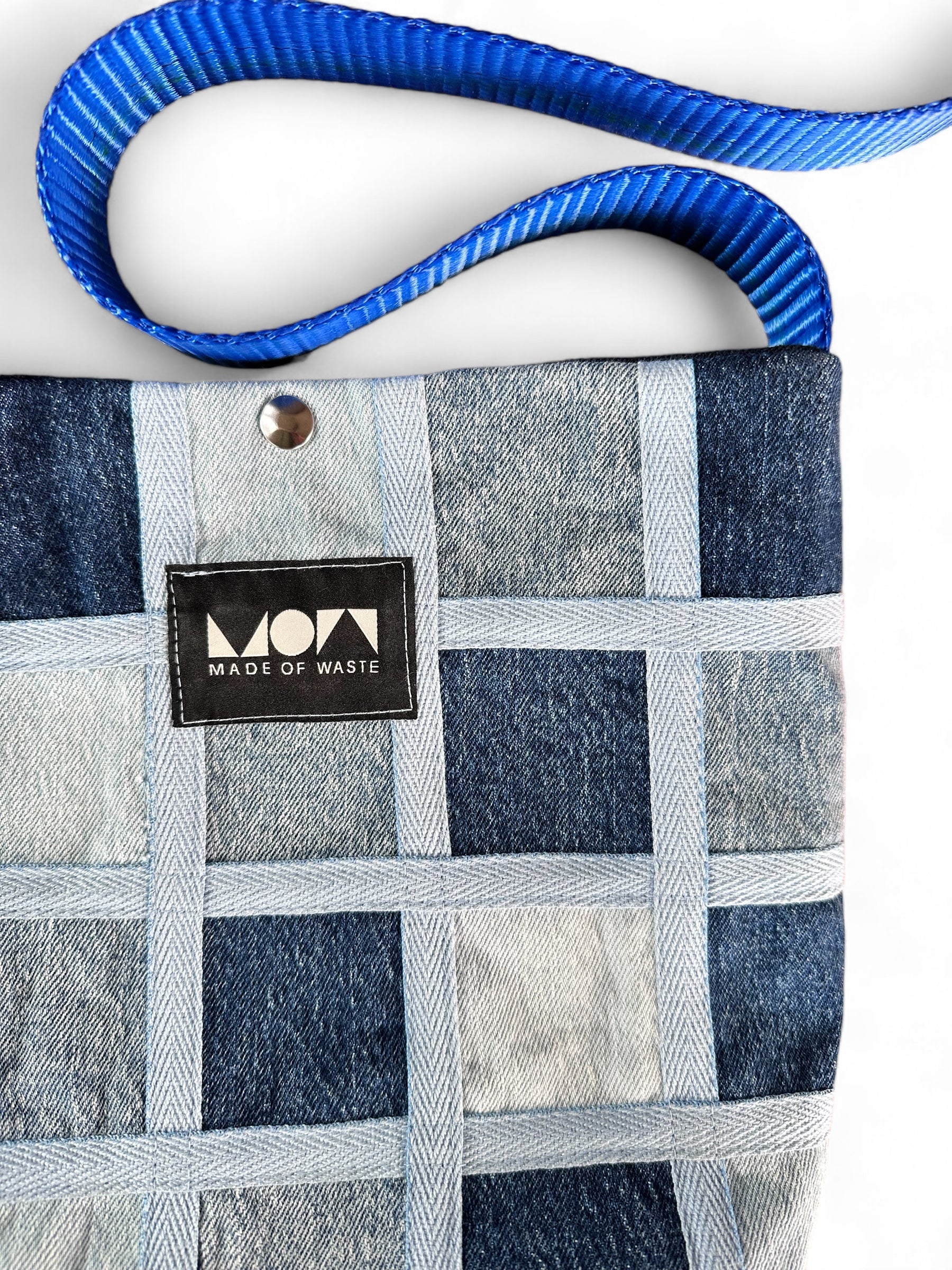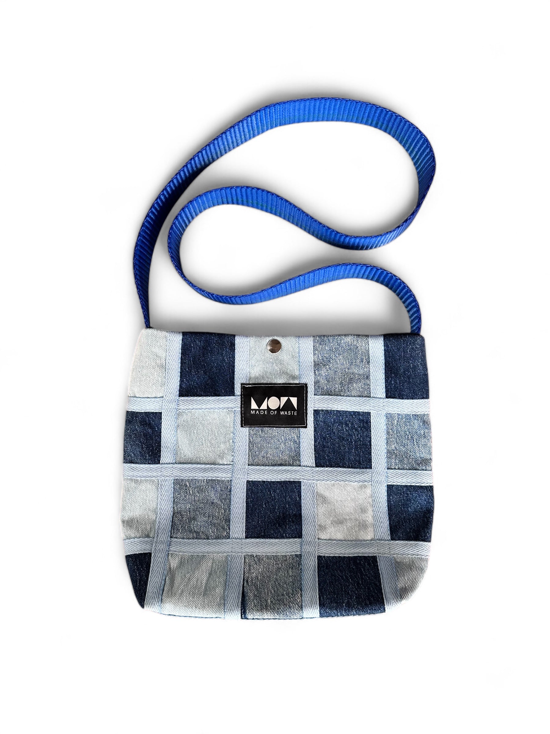 One of a kind denim side bag made from pre-consumer fashion waste. Lined with dead-stock material with one external and one internal pocket.