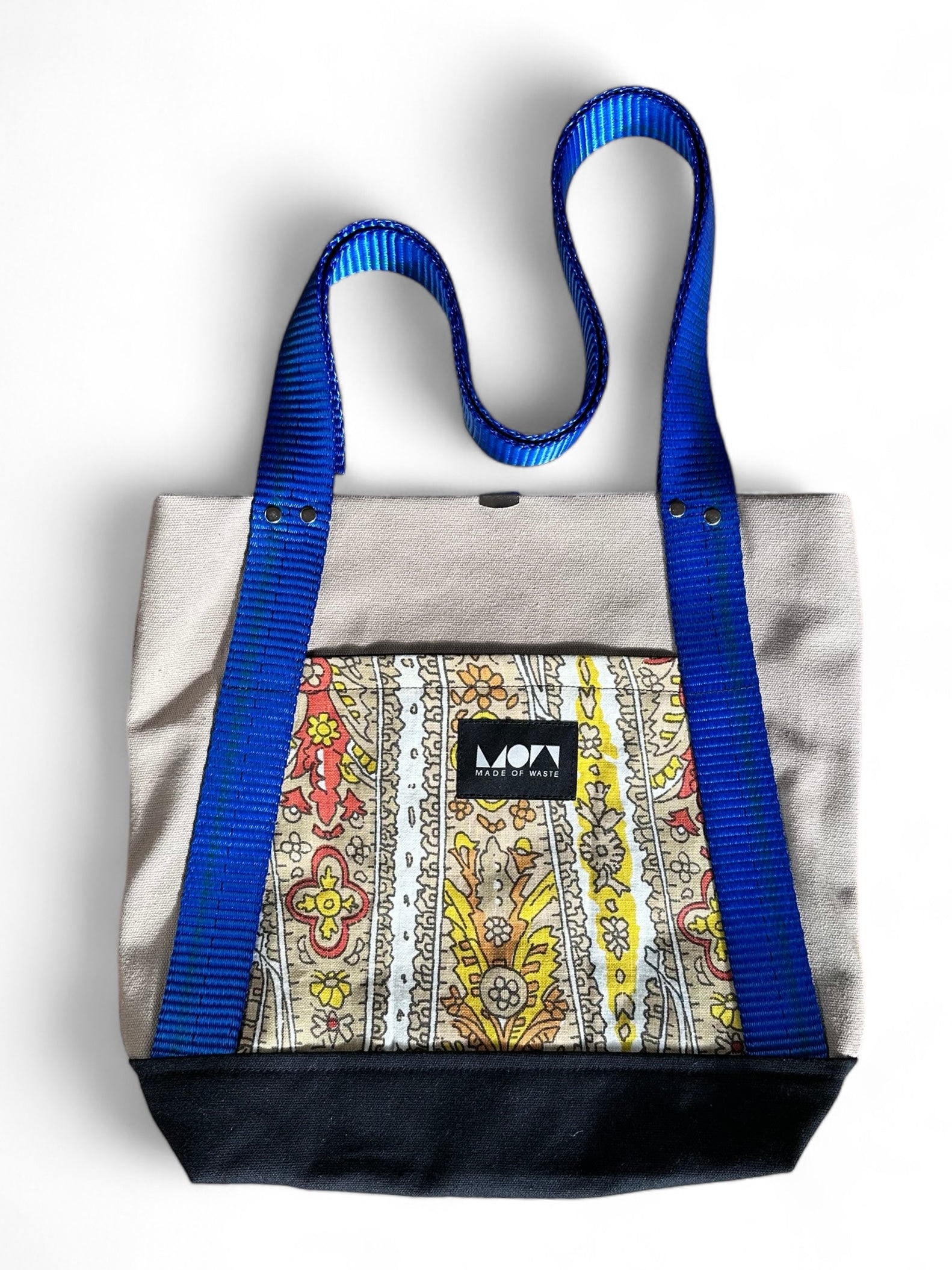 The external pocket fabric is from hand printed designer cushion cover samples from Italy. The handle is sourced from ratchet webbing that didn't pass load testing.