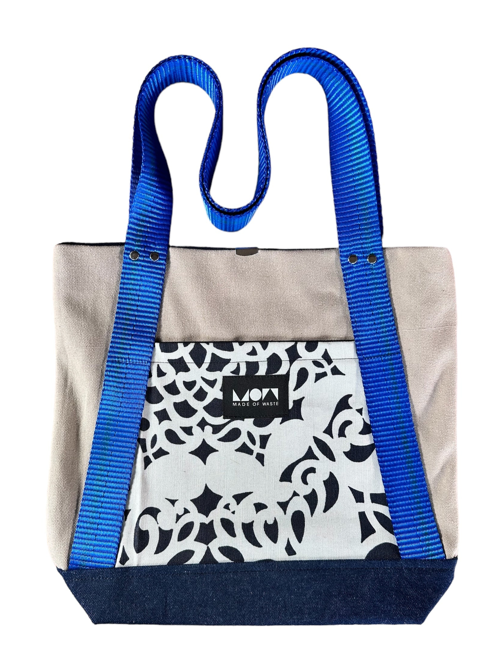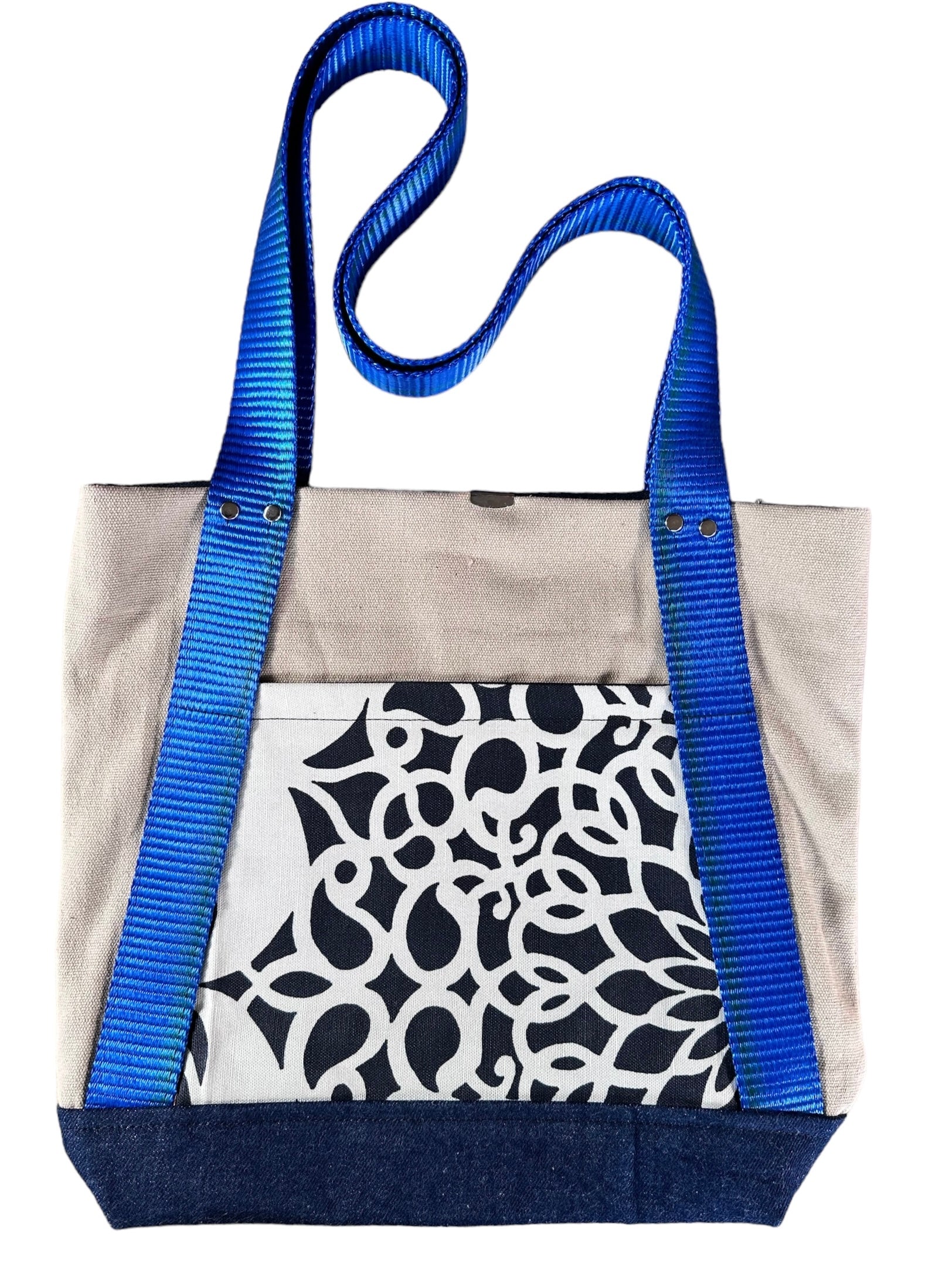 The external pocket fabric is from hand printed designer cushion cover samples from Italy. The handle is sourced from ratchet webbing that didn't pass load testing.