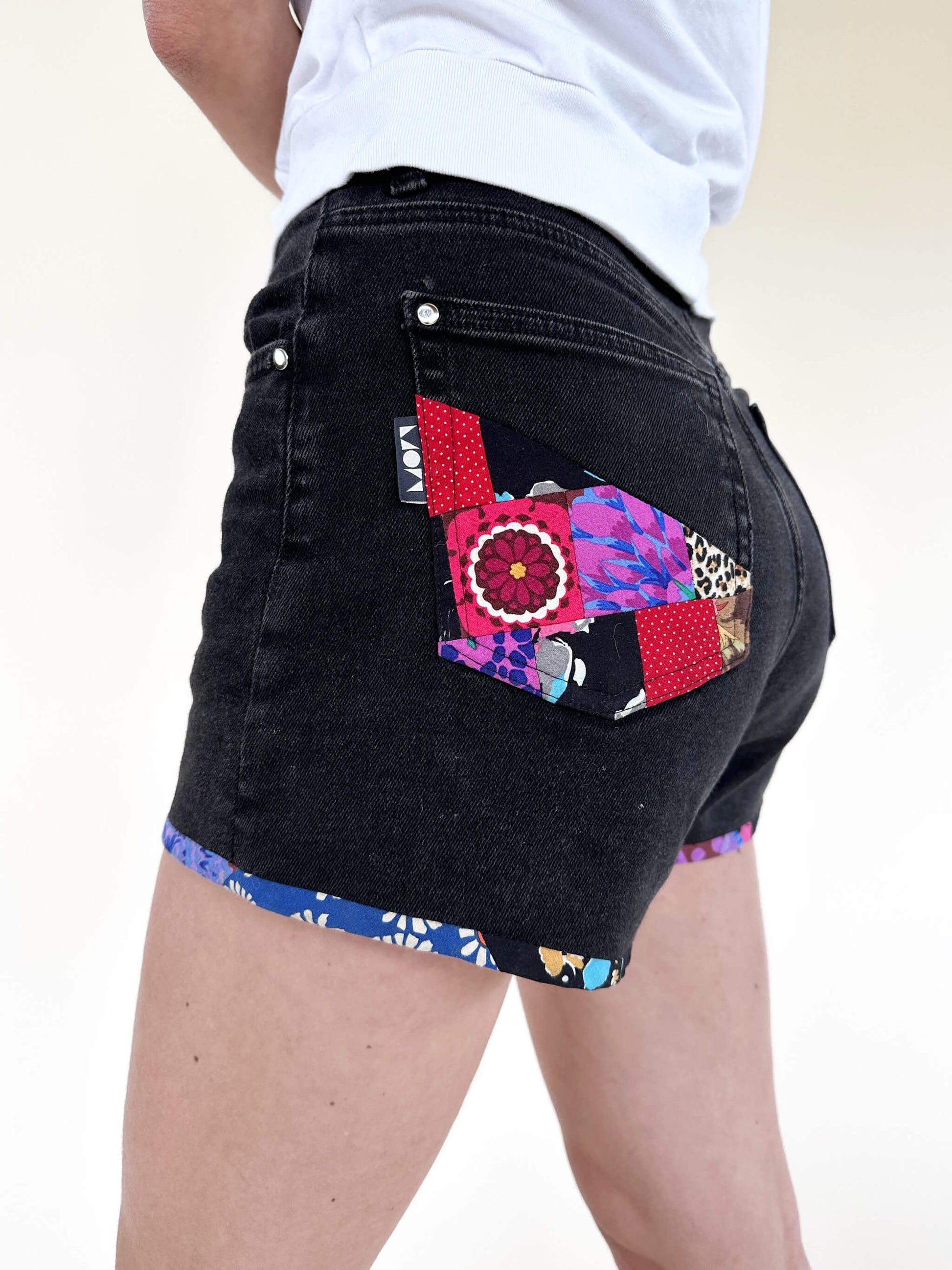 The Craftivist denim shorts are hight waisted, black with a hint of stretch. A distinctive patchwork of vintage fabrics adds a burst of colour to one pocket and bias binding edge. Model is wearing a size 6. Please allow one week for construction.