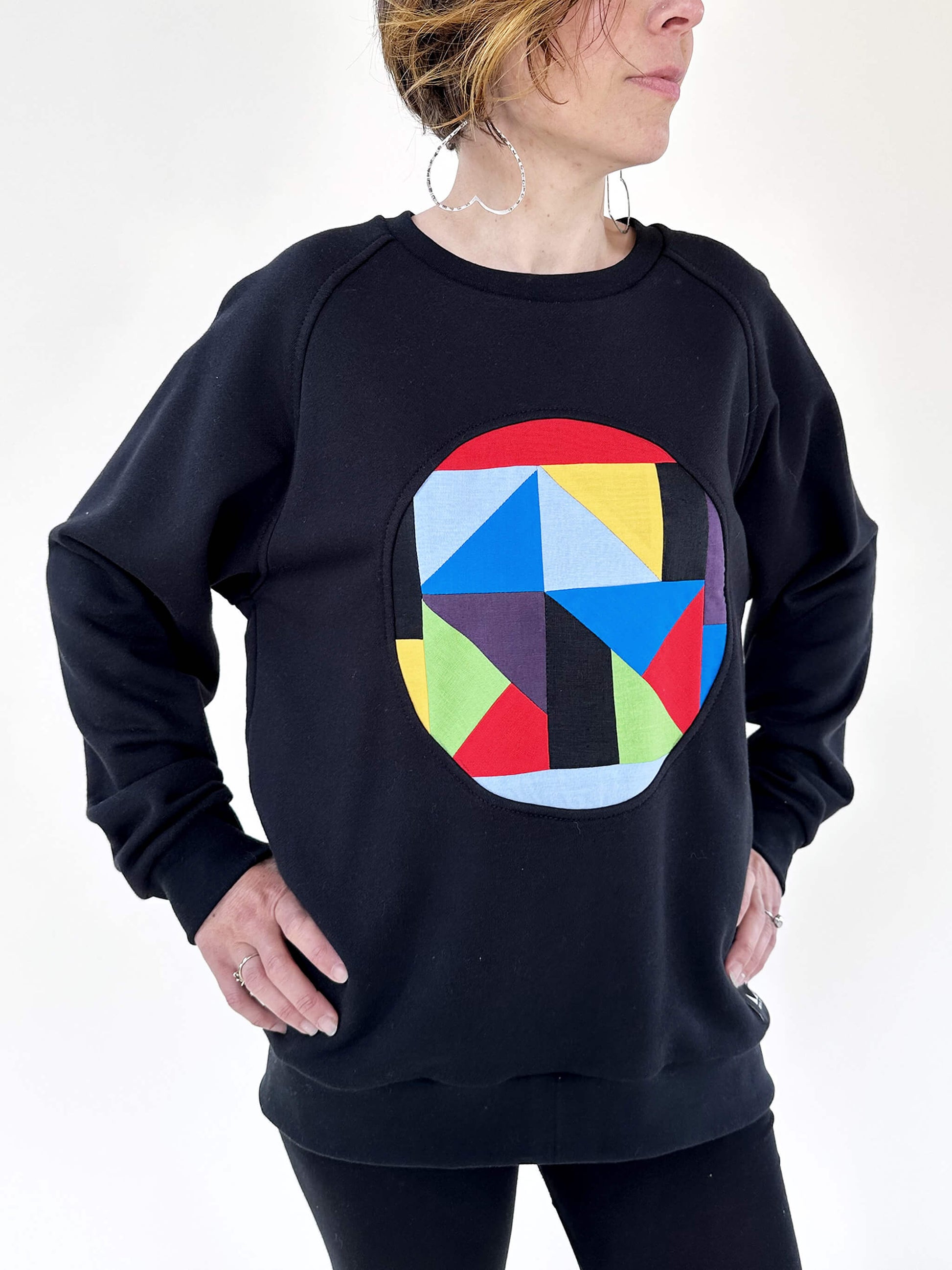 These hand-made sweaters are made from dead-stock cotton fleece and feature a central patchwork motif made from fabric scarps. If you don’t see your size it’s possible to request a custom order with a colour combination of your choice (subject to availability).