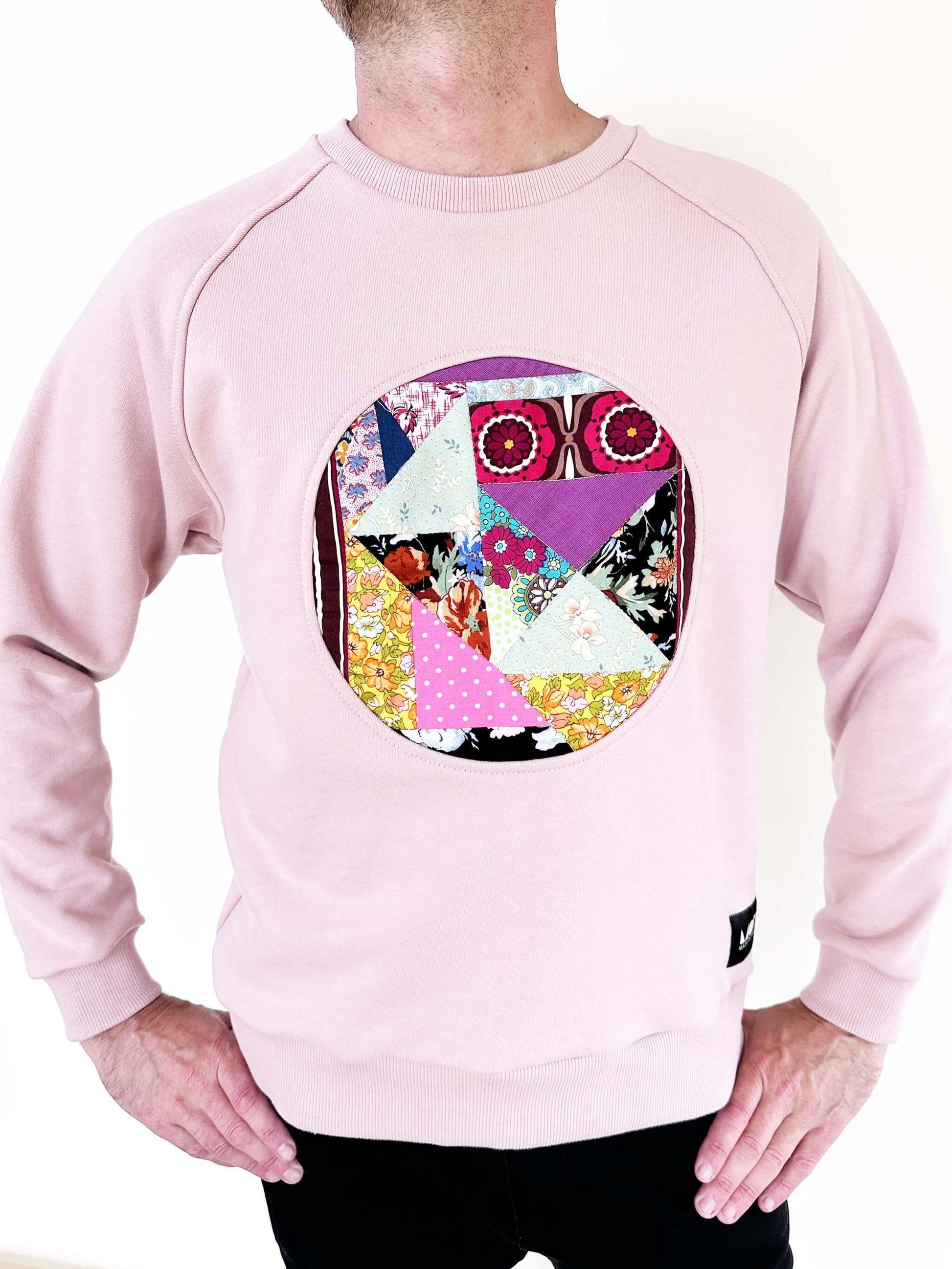 These hand-made sweaters are made from dead-stock cotton fleece and feature a central patchwork motif made from fabric scarps. If you don’t see your size it’s possible to request a custom order with a colour combination of your choice (subject to availability).