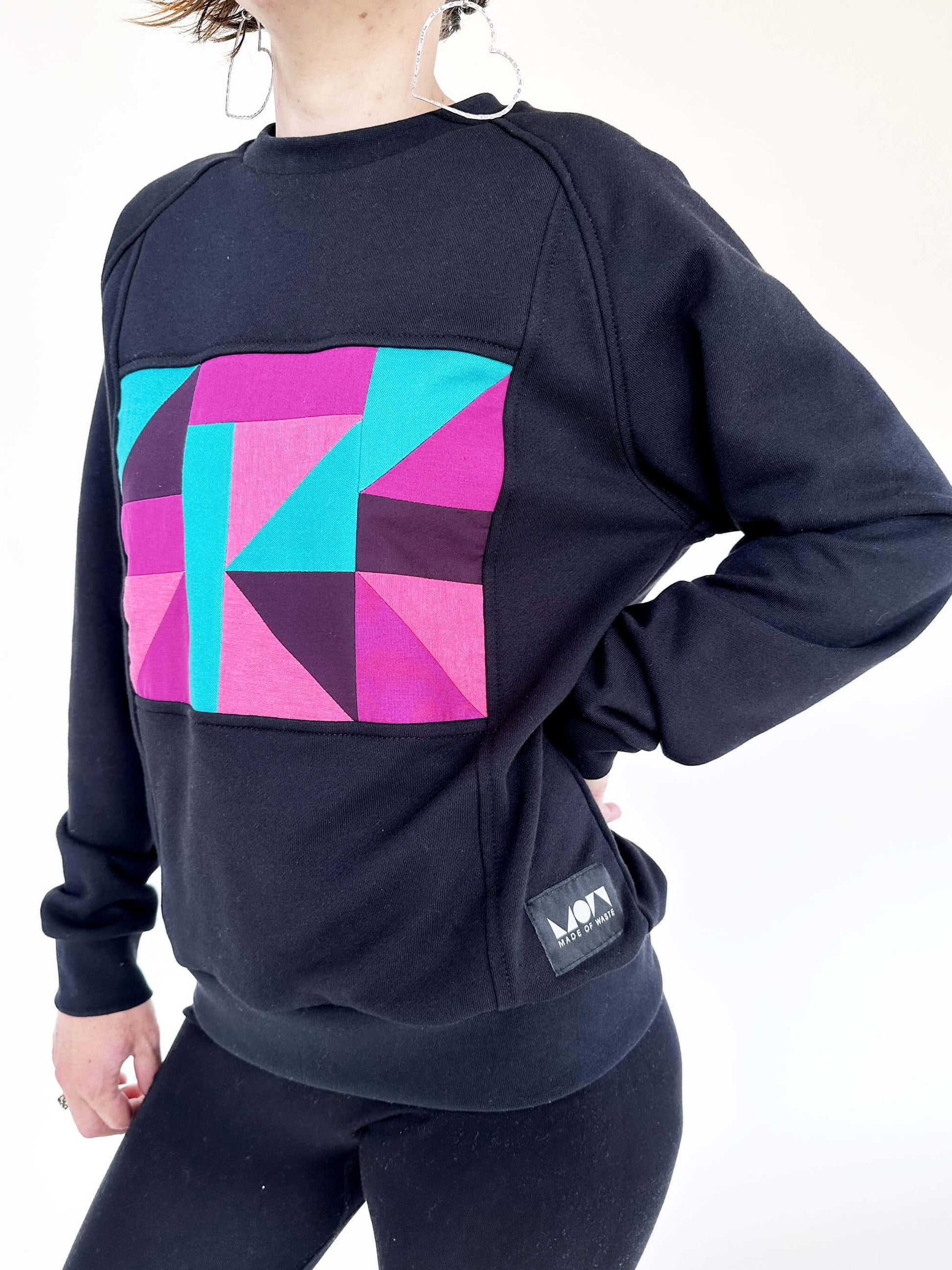 These hand-made sweaters are made from dead-stock cotton fleece and feature a central patchwork motif made from fabric scarps. If you don’t see your size it’s possible to request a custom order with a colour combination of your choice (subject to availability).
